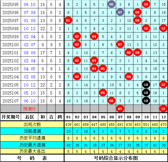 在历史同期奖号中,后区奖号跨度尾数大小比为11:6(定义:跨度1、2、3、10、11为小尾跨度,跨度4、5、6、7、8、9为大尾跨度),其中大尾跨度开出频次较多,本期预计继续开出大尾跨度,关注跨度5。